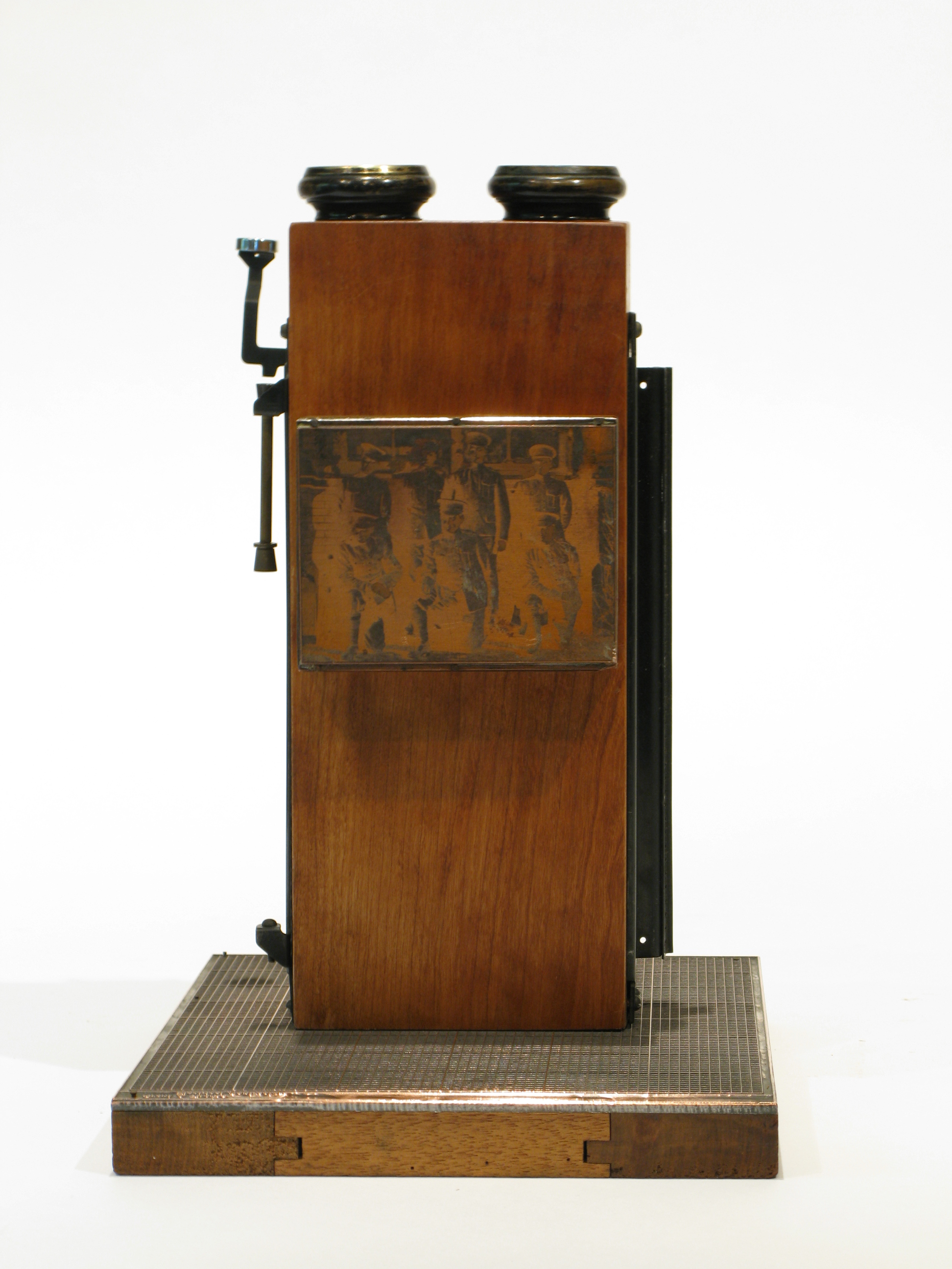 12.25in x 8in x 11in, wood, metal and ceramic.